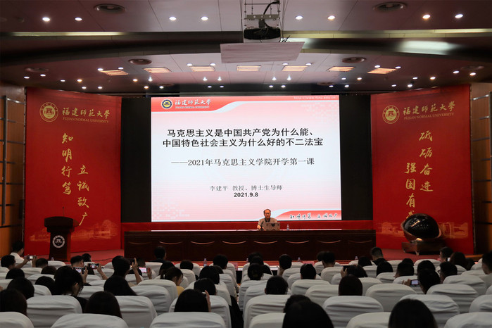 9月8日上午,马克思主义学院邀请中央“马克思主义理论研究与建设工程”首席专家、江南(中国)马克思主义理论一级学科创始人、原校长李建平教授为2021级新生讲授开学第一课。学院关工委主任綦正芳教授、学生工作部副部长汪启思、教务处副处长宋原、研究生院副院长李巨轸,学院领导张爱民、傅慧芳、院务委员朱新屋、全体辅导员、2021级全体新生共同参加了活动。活动由院党委副书记叶龙祥主持。