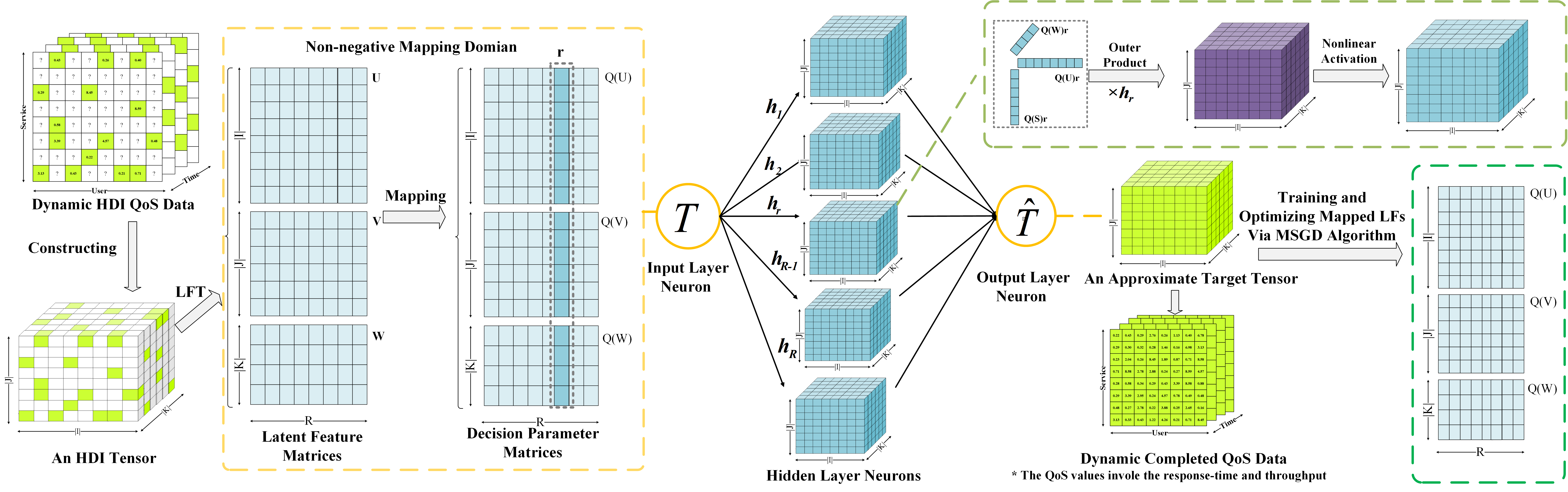当前传统非负张量隐因子分解模型尽管能够有效表征高维不完备张量,但其仍面临两个主要局限:首先,该类模型本质上是线性的,难以捕捉高维不完备张量中潜在的非线性特征;其次,模型依赖于随机初始化的非负参数以及专门设计的非负训练方案。