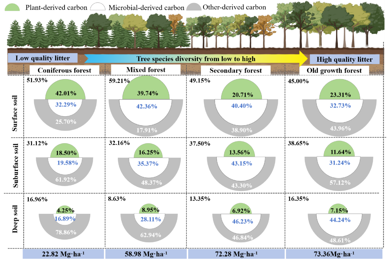 研究发现:在长期森林恢复过程中,亚表层与深层土壤对有机碳总储量增加的贡献显著高于表层,这补充了传统上以表层碳库为核心的认知。通过对微生物残体碳与木质素酚的耦合分析发现,与表层相比,亚表层与深层土壤中微生物残体碳与木质素的积累虽相对滞后,但增长趋势更为显著。此外,不同深度土壤碳库的主导调控因子差异明显:表层碳库积累与植物源碳比例呈负相关,而亚表层和深层则与微生物源碳比例呈协同增长关系。这些发现共同构建了一个面向“精准生态修复”的三元框架:(1)通过缓解深层土壤养分限制,优先提升深层土壤碳固存;(2)通过优化树种混交比例以平衡木质素输入与微生物周转,引导植物–微生物碳耦合过程;(3)通过协同根系性状与微生物化学计量需求,优化碳在土壤剖面中的垂直分配。该研究重新定义了生态修复的策略思维,强调应全面调动土层特异性的生物地球化学过程,为实现全剖面土壤有机碳固存的最大化提供了科学路径。