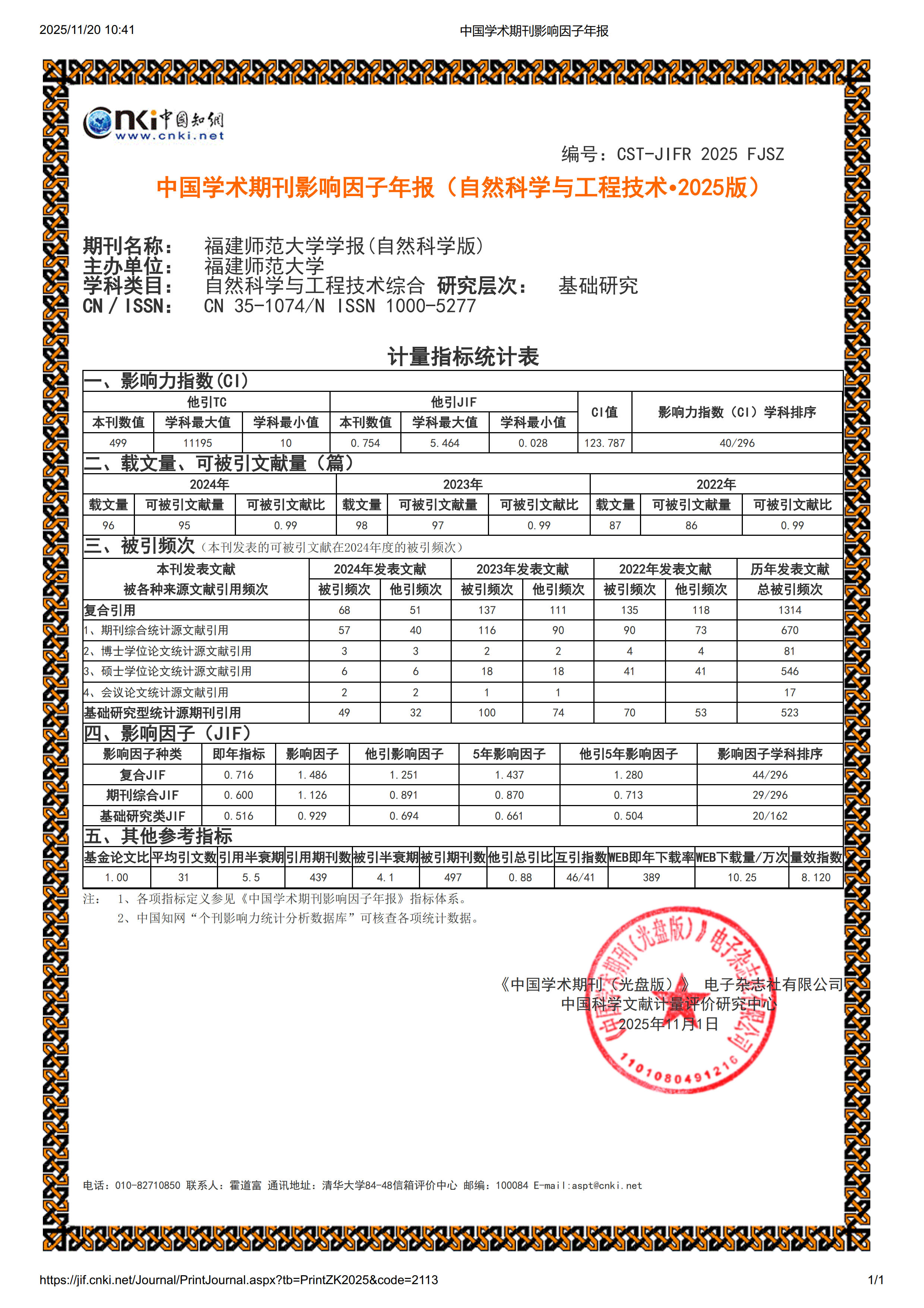 日前,《中国学术期刊(光盘版)》电子杂志社有限公司、中国科学文献计量评价研究中心联合发布《中国学术期刊影响因子年报(自然科学与工程技术• 2025版)》。数据显示,《江南网页版官网学报(自然科学版)》学术影响力持续提升,连续8年位于Q1区,影响力指数CI值为123.787,期刊综合影响因子相较上一年提升45.10%,再创历史新高。在自然科学与工程技术综合类296种期刊中排名第40位,相比上一年前进18位,首次跃升至福建省首位。(学报编辑部)