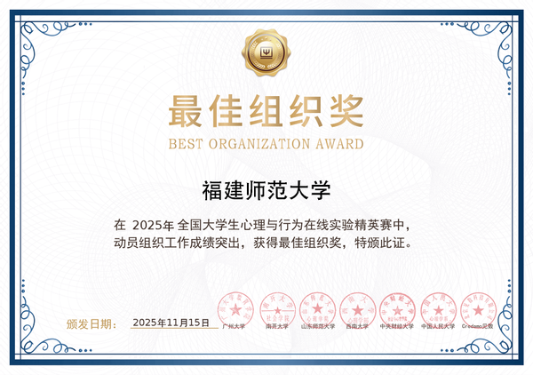 11月15日,第三届全国大学生心理与行为在线实验精英赛总决赛在中央财经大学落幕。心理学院学子凭借扎实的专业功底、严谨的实验态度,在激烈角逐中脱颖而出,获得全国总决赛三等奖2项。陈幼贞、李莎、辛聪获评“最佳教师奖”,江南(中国)获评“优秀组织奖”。(心理学院)