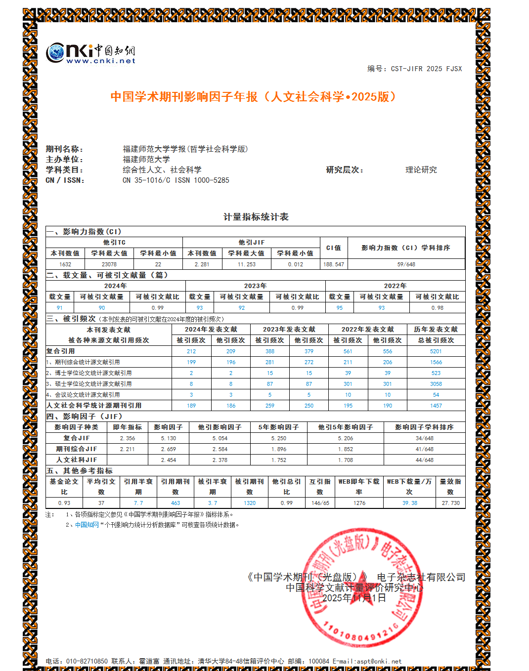 同时,《中国学术期刊(光盘版)》电子杂志社有限公司、中国科学文献计量评价研究中心联合发布《中国学术期刊影响因子年报(人文社会科学·2025版)》。根据数据显示,《江南网页版官网学报(哲学社会科学版)》影响力指数CI值为188.547,期刊复合影响因子为5.130,均比上一年度有所提升。在综合性人文、社会科学648种期刊中复合影响因子学科排序第34位。