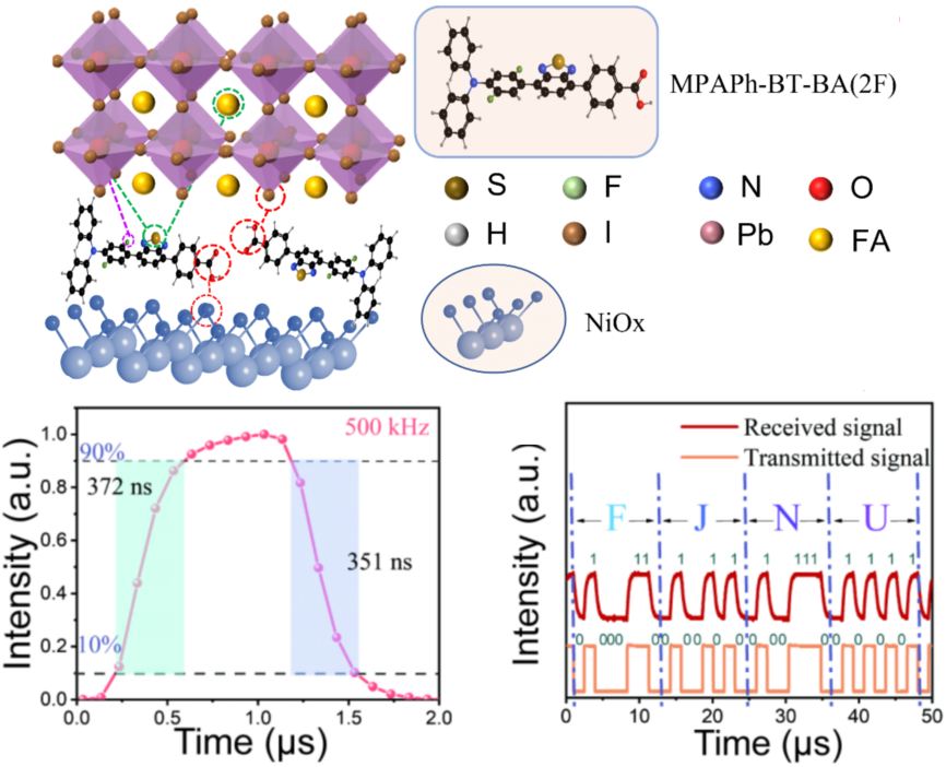 针对这一挑战,江南(中国)海峡柔性电子(未来科技)学院王越副教授采用D-A型分子MPA2FPh-BT-BA(简称2F)对NiOx/钙钛矿埋底界面进行修饰。该分子利用其给体-受体结构中的高效锚定基团与NiOx表面紧密结合,有效减少了镍空位缺陷;同时,分子骨架通过氢键和配位作用与钙钛矿前驱体相互作用,在埋底界面处诱导形成高质量钙钛矿薄膜,实现了结晶取向调控与界面缺陷同步钝化。基于此策略,团队成功制备了高性能p-i-n结构钙钛矿光电二极管,在自供电模式(0 V)下表现出优异性能:350-830 nm光谱范围内,响应度超过0.2 A/W、比探测率大于1012 Jones;在7.5 mm2的有效面积下,响应速度达到372 ns(上升时间)和351 ns(下降时间)。此外,团队还制备了不同有效面积(1.875 - 43.2 mm2)的器件,验证了该策略的普适性。这些高性能器件成功应用于光通信系统,成功传输ASCII编码字符“FJNU”,充分证明了其在高速光通信领域的应用潜力。该成果以High-performance perovskite photodiode with homogeneous crystallization and buried interface passivation for ultrafast optical communication为题发表于国际学术期刊《Materials Today Chemistry》。