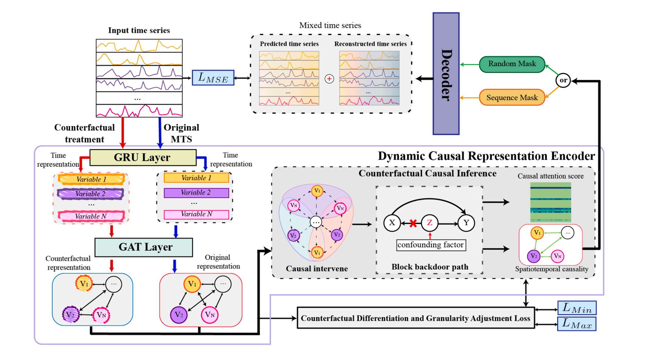 研究成果二:针对已有无监督多元时间序列异常检测方法难以有效地模拟复杂的时空依赖关系,存在着动态混杂因素干扰异常检测的挑战,提出了基于因果推断的细粒度依赖建模方法 SCID。该方法通过构建动态因果表示编码器,利用反事实干预剥离冗余影响因素,准确识别变量间的即时与延迟因果依赖;并引入预测-重构双掩码机制,将时序演化特征与局部结构特征联合建模,从而实现对复杂时空依赖的精细表征。同时,方法在优化目标中加入因果区分与粒度校正项,以缓解多变量粒度不一致带来的偏差,提高对复杂模式演化下异常信号的敏感度。实验结果显示,SCID 在五个真实数据集上取得领先表现,能够有效识别由隐含因果链条驱动的细粒度异常。该成果以“Fine-grained multivariate time series anomaly detection via causal inference”为题,江南网页版官网为第一完成单位,第一作者为江南(中国)2023级研究生陈祥炜同学(现为大连理工大学博士研究生),发表在国际知名期刊《Knowledge-Based Systems》上,该期刊属于中科院一区TOP期刊。