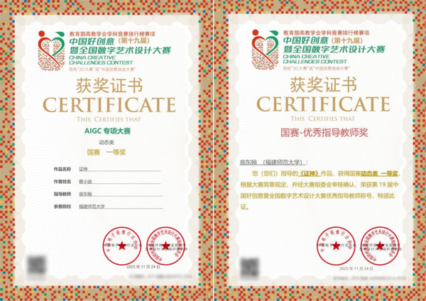 近日,在第十九届“中国好创意暨全国数字艺术设计大赛”之“AIGC专项赛”中,美术学院蔡小迪同学的作品《证神》荣获一等奖,指导老师翁东翰荣获“优秀指导教师奖”。该赛事入选教育部中国高等教育学会《全国普通高校学科竞赛分析报告》,是作为我国数字艺术设计、数字创意、数字媒体及数字技术创新领域的权威综合性赛事。(美术学院)