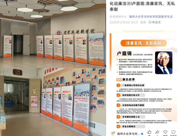 近日,化学与材料学院和福建省物构所合作,在理工楼15号科技楼大厅、桃苑12-13学生“一站式”社区开展“颂廉洁故事·扬清正风气”老科学家廉洁故事主题宣传展。