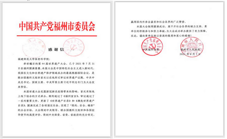 近日,中共福州市委、福州市人民政府向体育科学院发来感谢信,感谢学院在第44届世界遗产大会上的积极参与和努力奉献,为大会成功举办提供了有力保障。