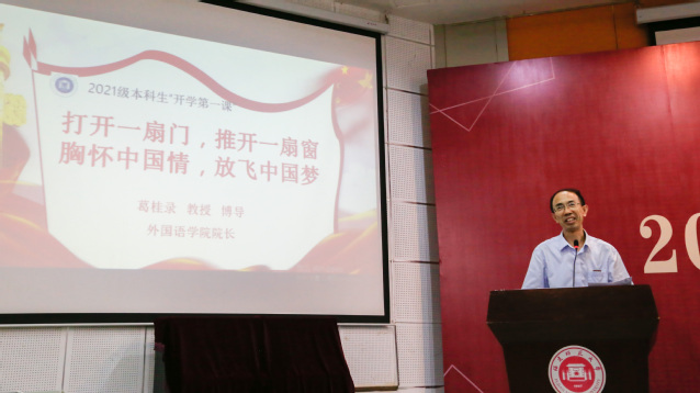 院长葛桂录在开学典礼上为本科新生带来题为“打开一扇门,推开一扇窗;胸怀中国情,放飞中国梦”的开学第一课,寄予新生借外语之器,看广阔世界、为国家发展助力的厚望;与研究生新生分享“语言为文化插上翅膀,学术为思想增添活力”,希望研究生新生能够增强创造意识,提高创新能力,产出科研成果,凭借学术研究释放外语学人的无尽潜力。