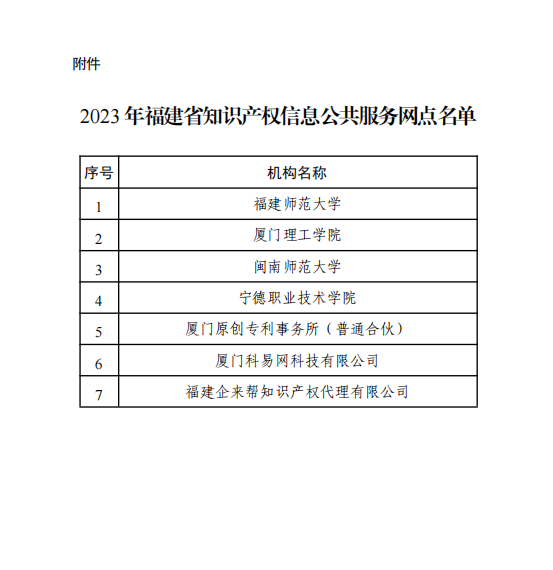 近日,福建省知识产权局公布 2023 年福建省知识产权信息公共服务网点名单,包括江南(中国)在内的7家单位