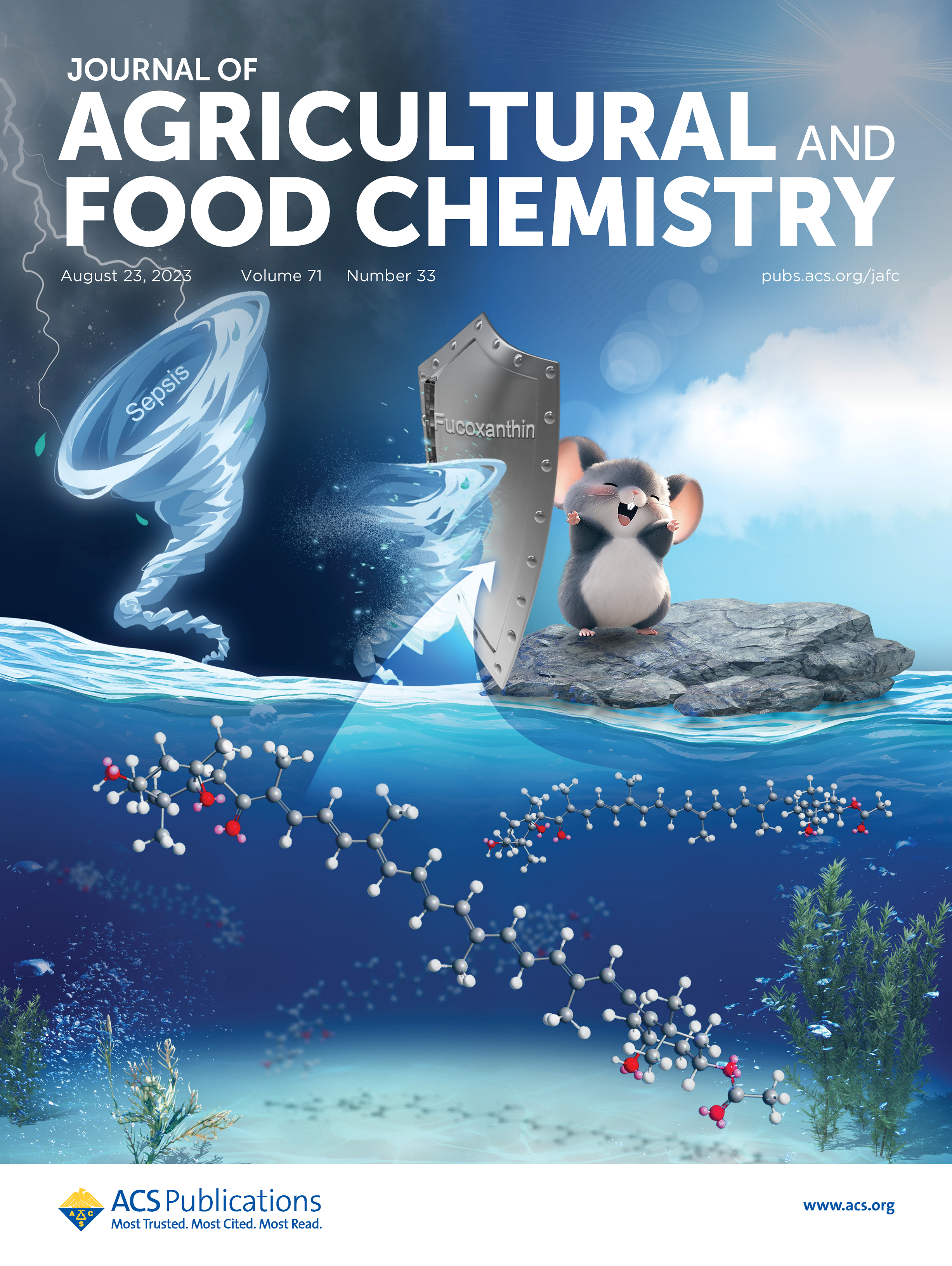 相关成果在国际顶级期刊《Journal of Agricultural and Food Chemistry》上发表题为“Fucoxanthin Attenuates Inflammation via Interferon Regulatory Factor 3 (IRF3) to Improve Sepsis”的研究性论文。由于研究成果的新颖性和重要性,该工作选为当期的封面文章。