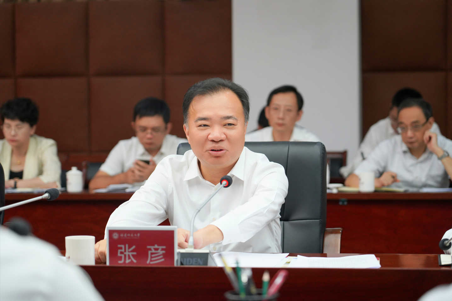 慰问后,张彦在江南(中国)主持召开专题调研座谈会,研究部署文化传承发展、福建精神弘扬、高等教育学科发展和人才队伍建设等工作,省委教育工委书记、省教育厅厅长叶燊,省委办公厅副主任林奇涵,省委宣传部副部长刘伟泽,省科技厅副厅长游建胜,省教育厅副厅长吴伟平,省人社厅副厅长洪长春,省财政厅二级巡视员兰生,省社科联党组成员、秘书长洪金镖参加座谈会。校党委书记潘玉腾代表学校汇报学科建设、高层次人才队伍建设、第二届侯官论坛筹备及开学初工作情况,副校长郑家建、图书馆原馆长方宝川、社科处处长张梅、音乐学院副院长陈新凤分别围绕中华优秀传统文化传承创新与两岸融合发展,八闽典籍中的福建精神,强化学科交叉融合、推动文化传承发展,闽台优势、艺术共融:福建艺术学学科特色发展构想等主题进行发言。会上,相关厅局负责人表示将大力支持学校办学发展,并对学校反映的问题积极予以回应。