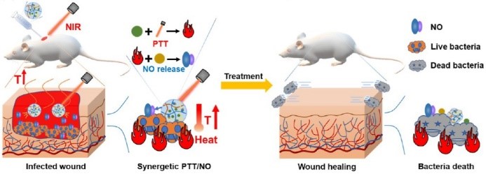 受损的皮肤不能防止有害细菌侵入组织,从而造成感染的伤口难以愈合甚至更为严重的组织损伤。为了解决这个问题,我们开发了一种新型的具有双功能域的两亲性微凝胶,通过光热抗菌协同NO释放,加速了伤口愈合。题为《基于环糊精的超分子微凝胶的设计制备及其在伤口愈合治疗平台的应用》(Cyclodextrin-modified amphiphilic microgel with bifunctional domains for infected wound healing via photothermal antibacterial therapy and nitric oxide release)发表在材料科学TOP期刊ACS Applied Materials & Interface上。这种具有三维网络状结构的环糊精修饰的两亲性微凝胶能同时封装亲水性的吲哚菁绿ICG作为光热疗法的触发剂以及疏水性的BNN6作为热敏性的NO供体,通过光、热的协同连锁反应,有效抵御了细菌感染,同时体内实验表明该微凝胶还能促进伤口区域新生血管和胶原纤维的生成,并消除炎症细胞,为发展促进伤口愈合的生物功能材料提供了一个新的研究思路。