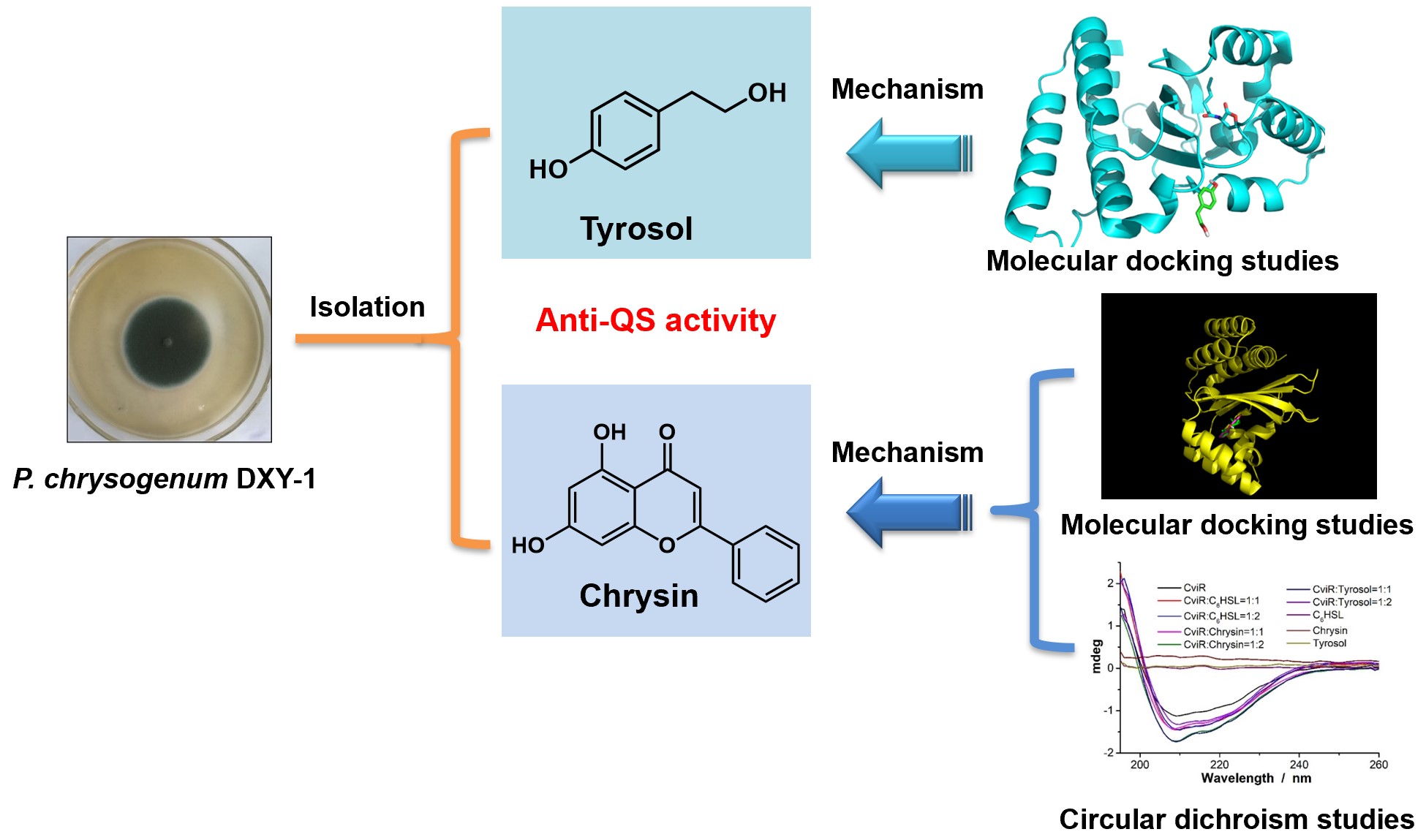 细菌群体感应 (Quorum sensing, QS)机制能够调控细菌的生存与致病性,是药学界研制抗菌药物的新靶标。题为“Exploring the quorum sensing Inhibition of isolated chrysin from Penicillium chrysogenum DXY-1”和“Tyrosol from marine fungi, a novel quorum sensing inhibitor against Chromobacterium violaceum and Pseudomonas aeruginosa”的研究工作以细菌群体感应(Quorum Sensing,QS)系统为靶标,从海洋真菌Penicillium chrysogenum DXY-1中分离获得了两种小分子QS抑制剂(对羟基苯乙醇和白杨素),并探究了分子作用机理。结果发现,小分子QS抑制剂能作用于QS受体蛋白CviR的DNA结合区域,改变CviR构象,使之不能与相应DNA结合,不启动相关基因表达,从而抑制致病因子产生及生物被膜形成,有效降低致病力。所得化合物可作为潜在的抗菌药物,有助于应对日益严重的细菌耐药性难题。