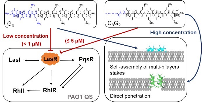 抗菌肽(AMPs)不但具有广谱性和不易诱发细菌产生耐药性等优点,而且能够通过分子间相互作用形成自组装体提高其抗菌活性。因此,开发高效的QS靶向的抗菌肽分子是解决细菌耐药性问题的重要策略之一。题为“Antimicrobial peptides fight against Pseudomonas aeruginosa at a sub-inhibitory concentration via anti-QS pathway”的研究工作系统探究了两条抗菌肽G(IIKK)3I-NH2(G3)和C8-G(IIKK)2I-NH2(C8G2)在亚抑菌浓度下作为群体感应抑制剂对抗机会性病原体铜绿假单胞菌的潜力,并阐明了它们的作用机制。研究结果表明,这些肽能以非竞争性方式与LasR结合,导致其二级结构变化,进一步影响下游基因的信号转导,从而抑制细菌的致病性。这种削弱致病菌的致病能力极大程度上降低了耐药性产生的可能性,使得这些AMPs成为开发新型肽-药物共轭物以治疗耐药性铜绿假单胞菌感染的药物前体。