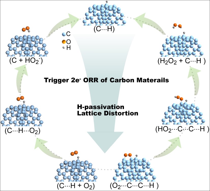 基于此,江南(中国)林良旭教授团队以碳布材料为研究对象,通过设计一种由氢原子钝化的晶格扭曲结构,实现了高效、稳定和高选择性两电子ORR反应,系统阐述了碳材料晶格扭曲和氢钝化在电催化活化上和选择性调控中的关键作用,为碳材料的ORR催化机理机制提供了新的理解,并为进一步阐述碳材料的ORR催化活化机制提供新的强有力的依据。该研究所阐述的催化活化机制是对碳材料ORR催化机理的有力补充,也解释了为什么碳材料在ORR中所表现出的诸多难以理解的实验现象,为更精准的催化电极设计提供参考和依据。相关研究成果以“Lattice Distortion and H-passivation in Pure Carbon Electrocatalysts for Efficient and Stable Two-electron Oxygen Reduction to H2O2”为题发表在国际知名期刊Angewandte Chemie International Edition。