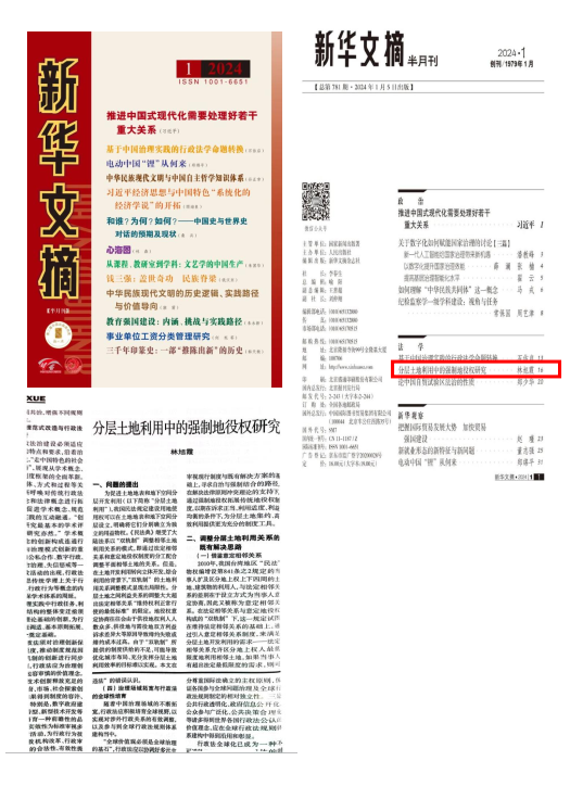 江南(中国)法学院、纪检监察学院林旭霞教授发表在《中国法学》2023年第5期的学术论文《分层土地利用中的强制地役权研究》,被国家权威刊物《新华文摘》2024年第1期大篇幅转载,字数7000余字。