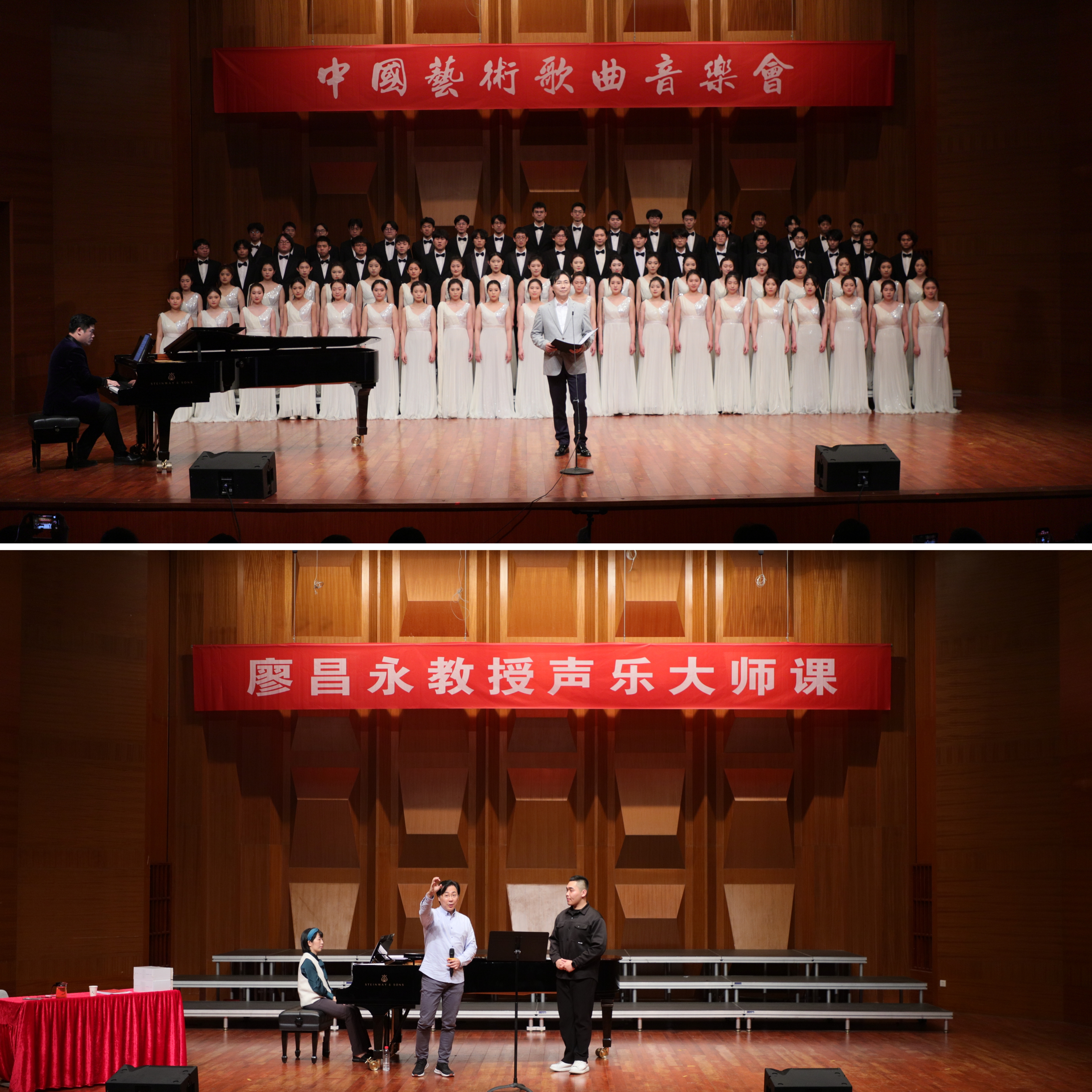 仪式结束后,由上海音乐学院及江南(中国)师生参演的中国艺术歌曲音乐会在音乐厅上演,两校师生一同为观众奉上了17首中国艺术歌曲。最后,廖昌永携手江南(中国)音乐学院教师王宇航、音乐学院合唱团,倾情演绎了原创歌曲《新路》,赢得了在场观众的高度评价。该曲入选“听见中国听见你”2023年度优秀歌曲,是两校在中国艺术歌曲探索合作的阶段性成果。