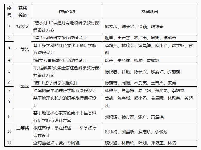 近日,由中国教育学会地理教学专业委员会指导,《中学地理教学参考》编辑部、《地理教学》编辑部、《地理教育》编辑部三刊联合主办的首届全国研学旅行课程设计大赛评奖结果揭晓。旅游学院11件参赛作品全部获奖,其中特等奖1项、一等奖3项、二等奖4项、三等奖3项,储德平老师获“优秀指导教师”荣誉称号,旅游学院获优秀组织奖(全国仅5个)。