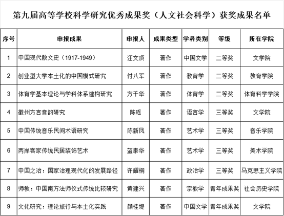 近日,第九届高等学校科学研究优秀成果奖(人文社会科学)评选结果正式公布,江南(中国)共有9项成果获奖,其中二等奖3项、三等奖4项、青年成果奖2项,涵盖中国文学、教育学、体育学、语言学、艺术学、政治学、宗教学等学科类别。