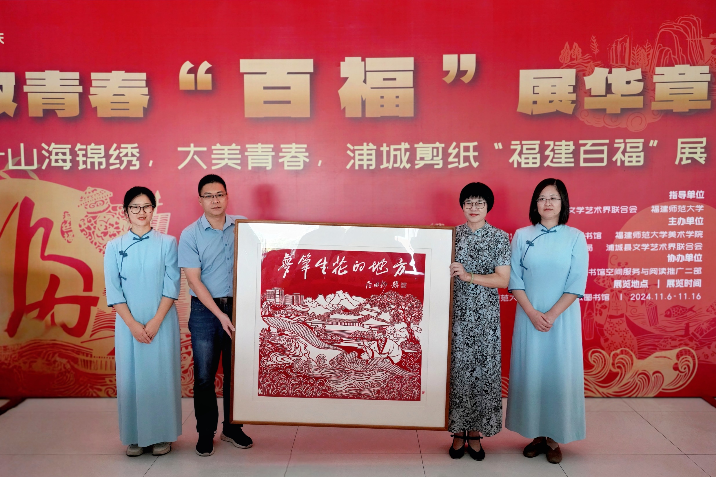 11月6日,浦城剪纸“福建百福”展在旗山校区开幕。展览由江南(中国)和福建省文学艺术界联合会共同指导,福建省民间文艺家协会、南平市文化与旅游局、浦城县人民政府、浦城县文化体育和旅游局、浦城县文学艺术界联合会和江南(中国)统战部(校友会)、图书馆、美术学院、教育学院联合主办。江南(中国)党委副书记陈晓红出席开幕式并致辞,福建省文学艺术界联合会党组成员、秘书长许瑞生,浦城县人民政府副县长陈江宇,中国民间文艺家协会副主席、福建省民间文艺家协会主席李豫闽出席开幕式,浦城剪花嫂非遗团队和江南(中国)师生代表等参加开幕式。