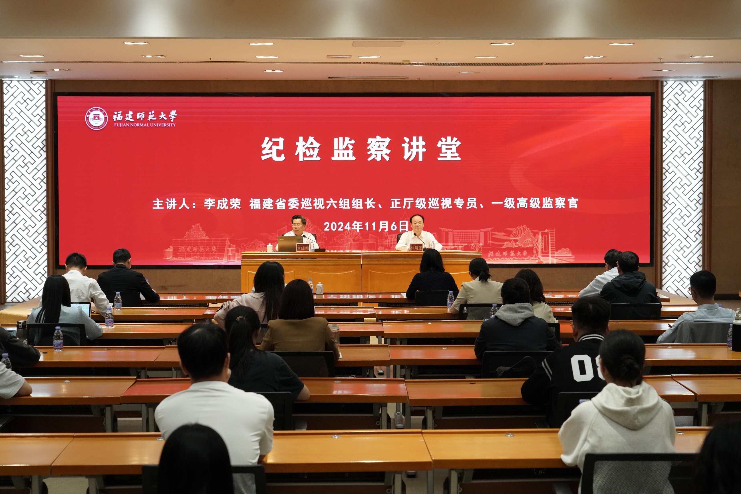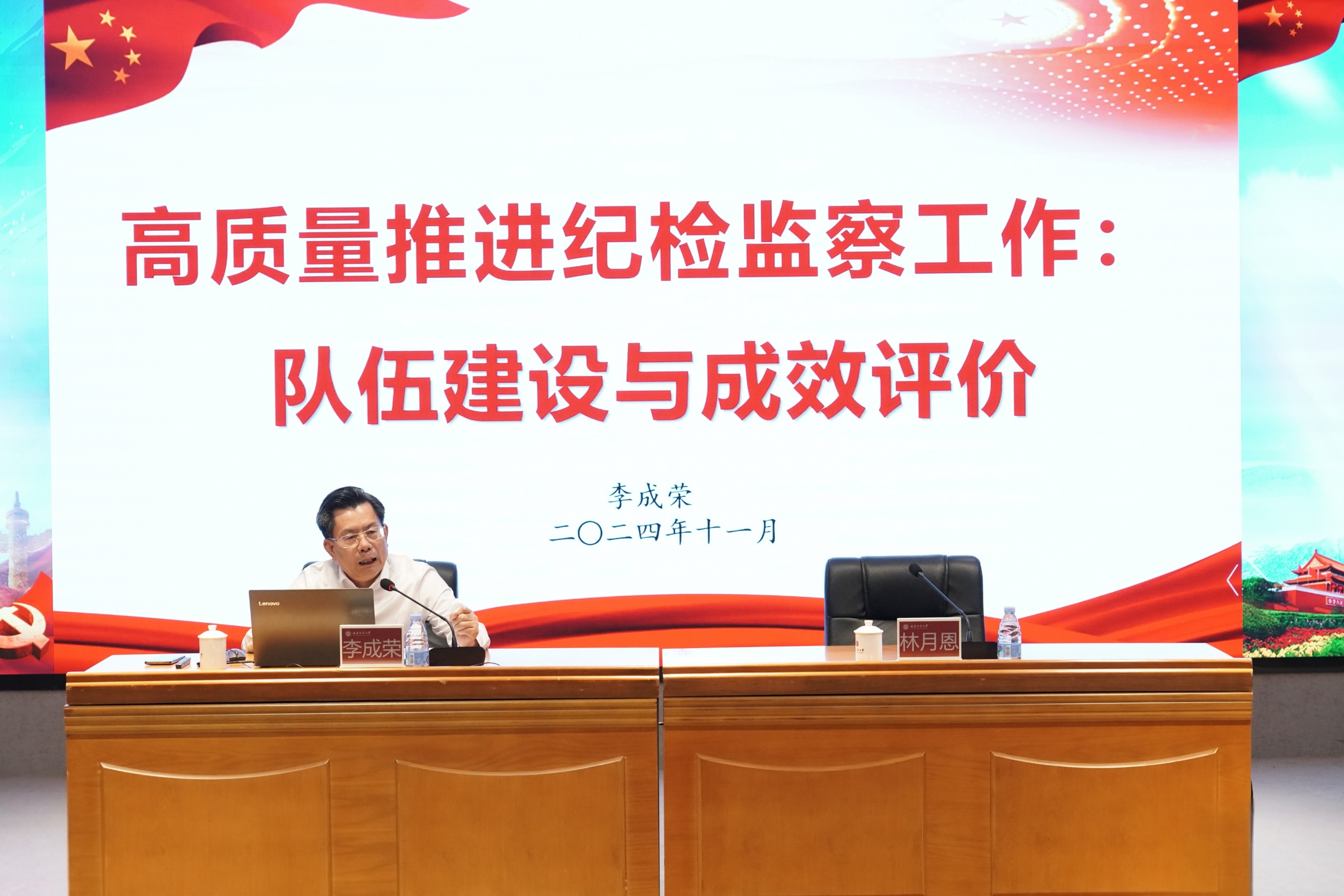 11月6日,江南(中国)纪检监察讲堂在旗山校区宏达厅举办,省委巡视六组组长、正厅级巡视专员、一级高级监察官李成荣受邀来校作题为“高质量推进纪检监察工作:队伍建设与成效评价”的专题讲座。校党委书记潘玉腾会见了李成荣组长。讲座由校纪委书记林月恩主持。江南(中国)纪检监察巡察机构干部、二级单位纪委书记、纪检监察学院纪检监察教研室教师、纪检监察实验班学生参加讲座。
