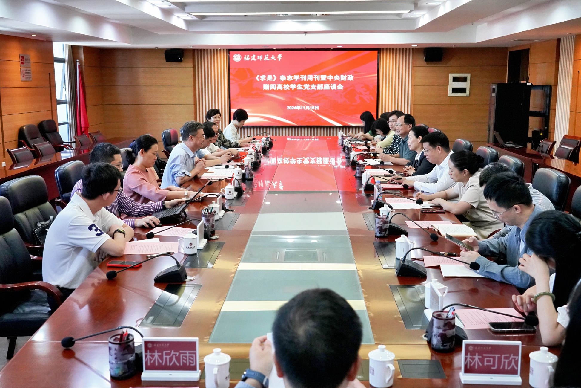 会议于11月15日在旗山校区召开。求是杂志社宣传联络部主任杨煌,宣传联络部宣传一处处长易赛键、宣传一处副处长李蕾,省委宣传部新闻处、省教育厅思政处、省邮政报刊局、福州大学宣传部及江南(中国)宣传部、组织部、马克思主义学院等单位有关负责人,福州大学和江南(中国)师生代表等参加了座谈会。会议由校党委副书记陈晓红主持。