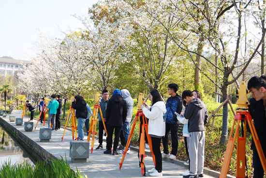 4月1日,杭州,浙江农林大学校园里的樱花林下,该校环境与资源学院的学生正在进行测绘类课程的实习实践。视觉中国供图