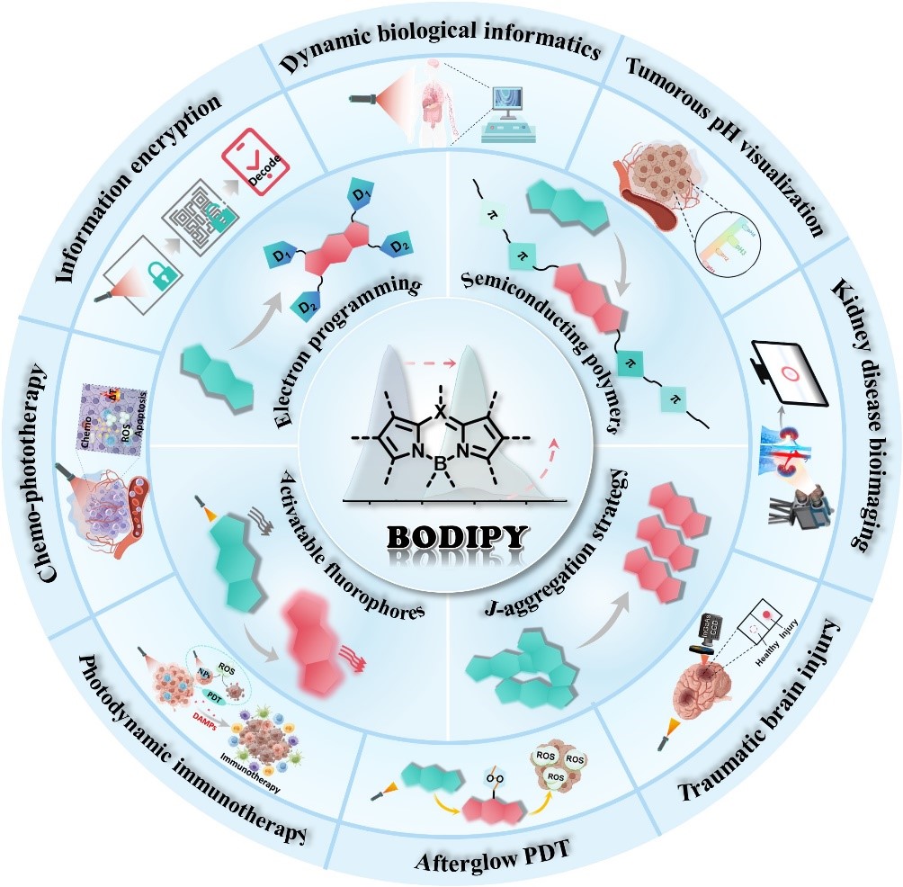 光学成像对于早期疾病诊断、及时的癌症和疾病治疗以及基础医学和生物学研究具有重要意义,与传统的光学成像相比,新开发的近红外二区(NIR-II,1000-1700 nm)荧光成像可以有效减少光子的散射和衰减以及组织的自发荧光,从而实现更深的组织穿透力、更好的空间分辨率和更高的信噪比。在NIR-II发射的有机染料中,氟硼二吡咯化合物(BODIPY)具有可控的分子结构和光学特性、出色的荧光量子产率、高摩尔吸收系数和显著的化学稳定性,在NIR-II诊疗领域展现出极大的应用前景。