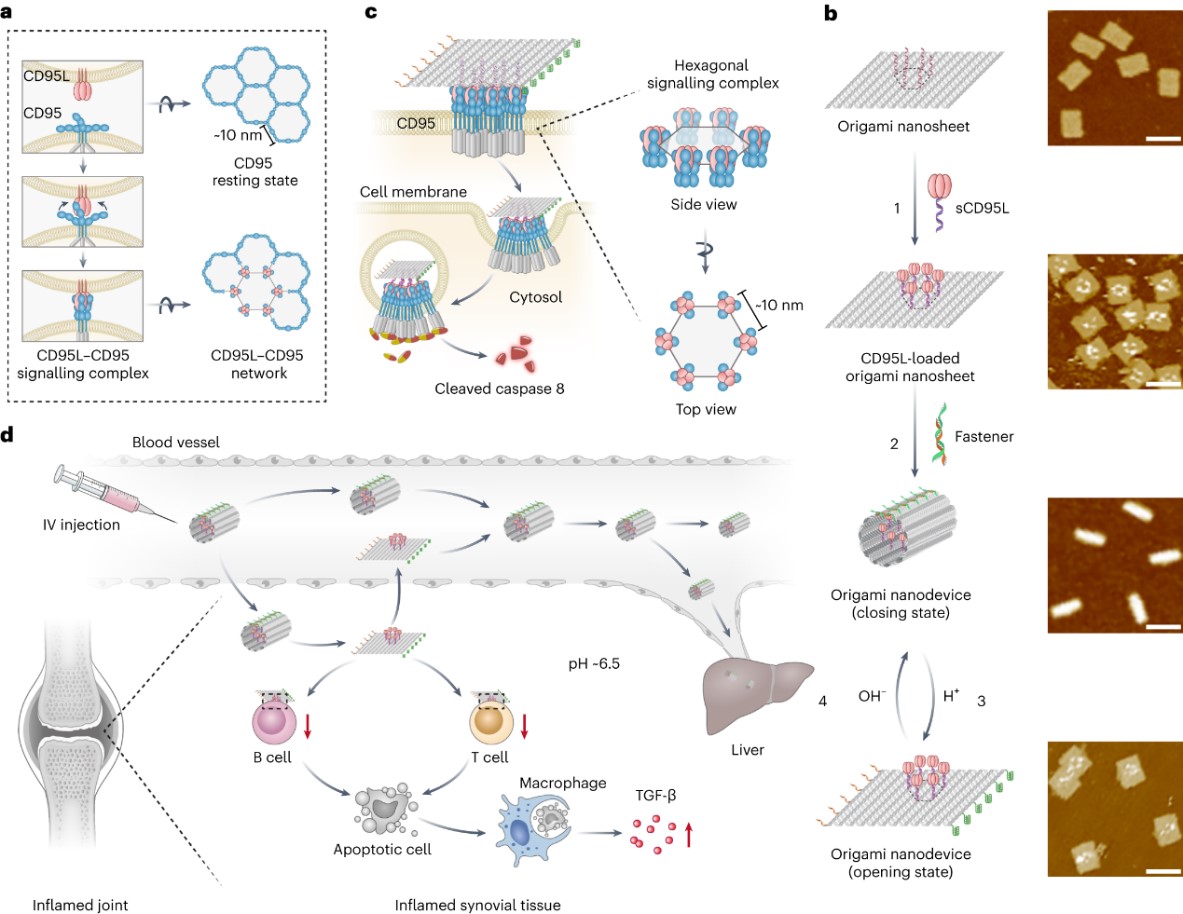 近日,江南(中国)杨震教授联合新加坡NUS陈小元教授、南京邮电大学晁洁教授、四川大学李玲教授团队,在国际顶尖期刊Nature Materials发表题为“A DNA origami device spatially controls CD95 signalling to induce immune tolerance in rheumatoid arthritis”的研究性论文。
