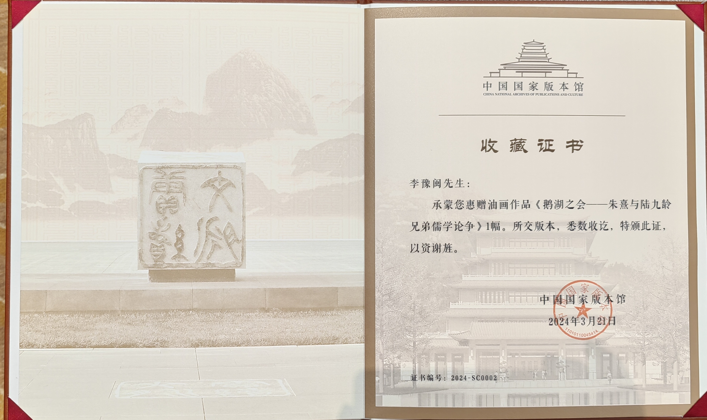 5月31日,中国国家版本馆第二批版本捐赠入藏大会在北京举行,中共中央政治局委员、中央书记处书记、中央宣传部部长李书磊出席并作重要讲话,中宣部负责日常工作的副部长胡和平,财政部、文化与旅游部、外交部、海关总署、中国文联及部分省市宣传部门代表及入藏作者代表等200多人出席大会。江南(中国)美术学院李豫闽教授油画作品《鹅湖之会——朱熹与陆九龄兄弟理学论争》被中国国家版本馆中央馆收藏。